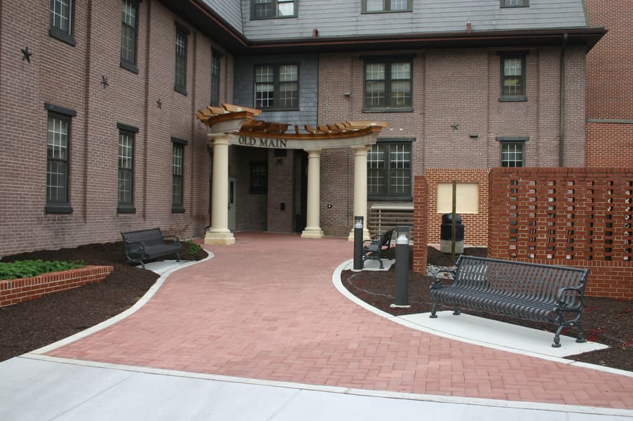 Greenfield Architects performed exterior and interior renovations to provide a new upgraded look to the entire Entry Courtyard area, providing a fully accessible and ADA compliant building Entry. Exterior renovations included providing new sidewalks, curbing and landscape plantings and accessories, replacing concrete stairs, repairing planter beds and walls at the Basement, removing courtyard pavers and concrete and providing new pavers, removing ramps, steps and handrails, and adding a new Canopy/Pergola structure. Interior renovations included the upgrade of the existing interior stair and entryway to be a main access point to the building; providing new doors, hardware, card access systems, new finished interior walls, ceilings, flooring, lighting and paints throughout the stair tower; including recessed lights and wall washers for display wall.
