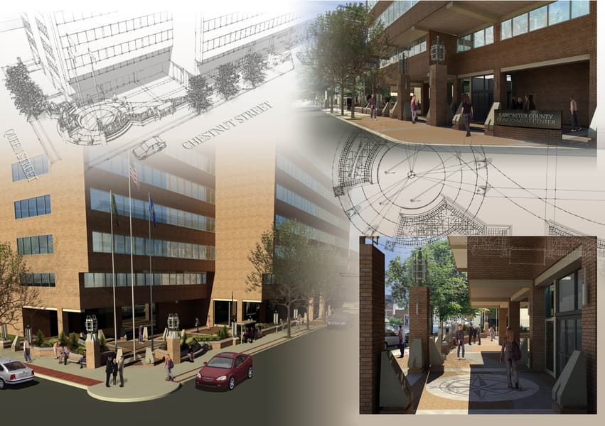 A separate contract was entered by the County of Lancaster to renovate the exterior plaza at 150 N. Queen St. completing this building project to include architectural elements to provide sidewalk entrance identification, security elements and public site amentities including new bus drop off, veteran's memorial, seating, and lighting along Chestnut St. where none existed previously. The program provided visual and pedestrian continuity around the building to and from Binn’s Park, a focal point that addresses the street intersection, planters and walkways to define the property or ‘zone’ around the building, a re-defined vehicular drop-off for the constables and deputies who use the District Justice Office in the first floor of the building, visual emphasis for the main entrance and enhancing the public and governmental character of the building. This project included the following design items which were refined during the schematic design through construction documentation phases. • New 30”-36” H raised planter beds. • Radiused cast stone and metal building signage. • Low growing, low maintenance, shade-tolerant or understory plantings. • Landscape design and plant selection. • Irrigation system. • New flagpoles. • New bus stop/canopies and seating (to be provided for Red Rose Transit Authority). • New pavers to match existing brick and cast concrete banding. • Heated walkways. • New vehicular drop off along Chestnut Street and curb cut locations. • New raised deputy vehicular parking area with low retaining walls and fencing on north and west sides. • Paver walkway grading. • Enhanced site lighting and bollards/bollard lighting. • Stormwater collection tied into existing public sewer system.